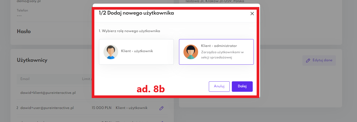 In the newly opened window, set the role of the new user (Client - user or Client - administrator) and press the Next button.
