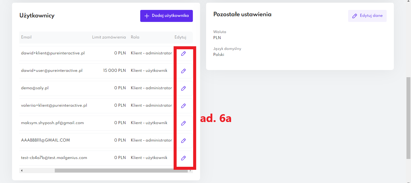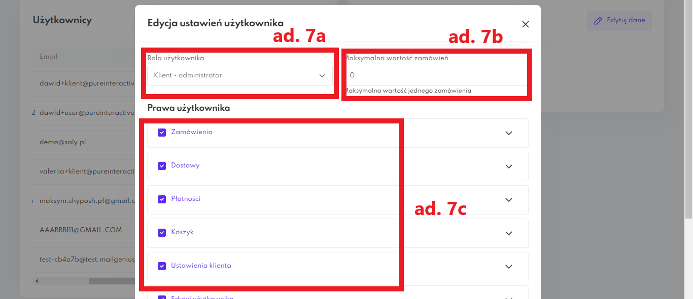 In the newly opened window, select the permissions you want to edit, and then press the Save changes button. The possibilities of editing the rights of the account users are described in point 7.