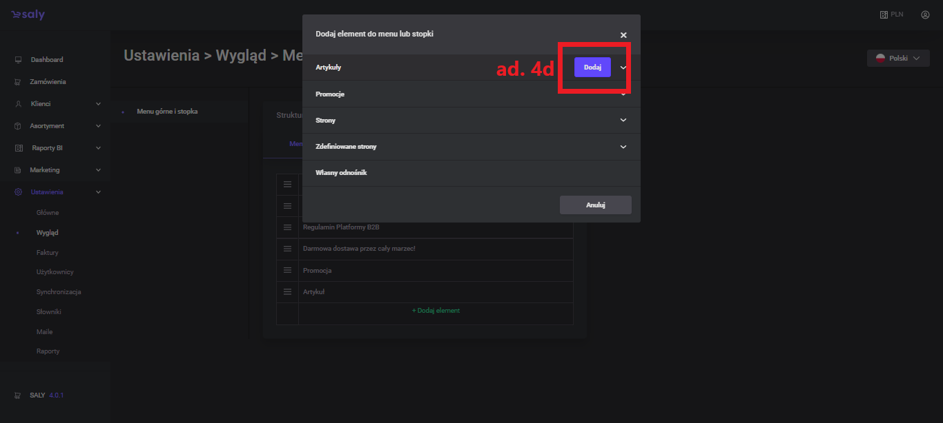 To add to the menu all items from the selected category (e.g. all articles or promotions), press the Add button next to the appropriate category.
