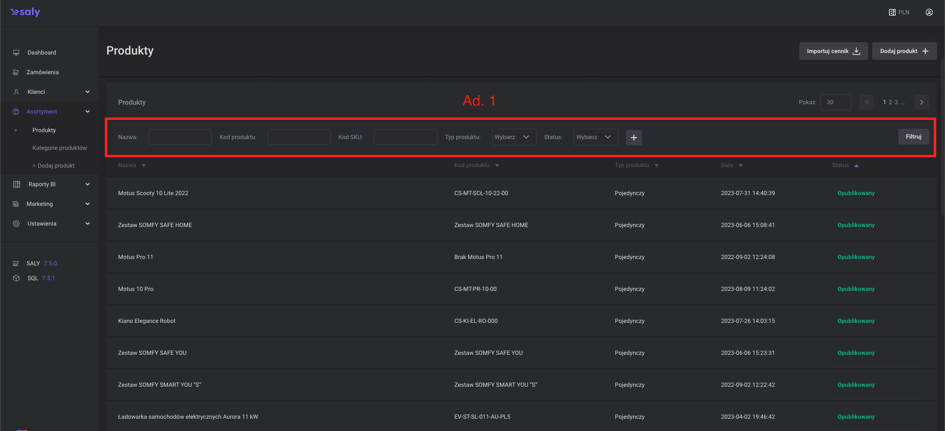 Aby filtrować listę produktów, uzupełnij okna filtrów lub wybierz z rozwijanej listy odpowiednią opcję i naciśnij przycisk Filtruj.