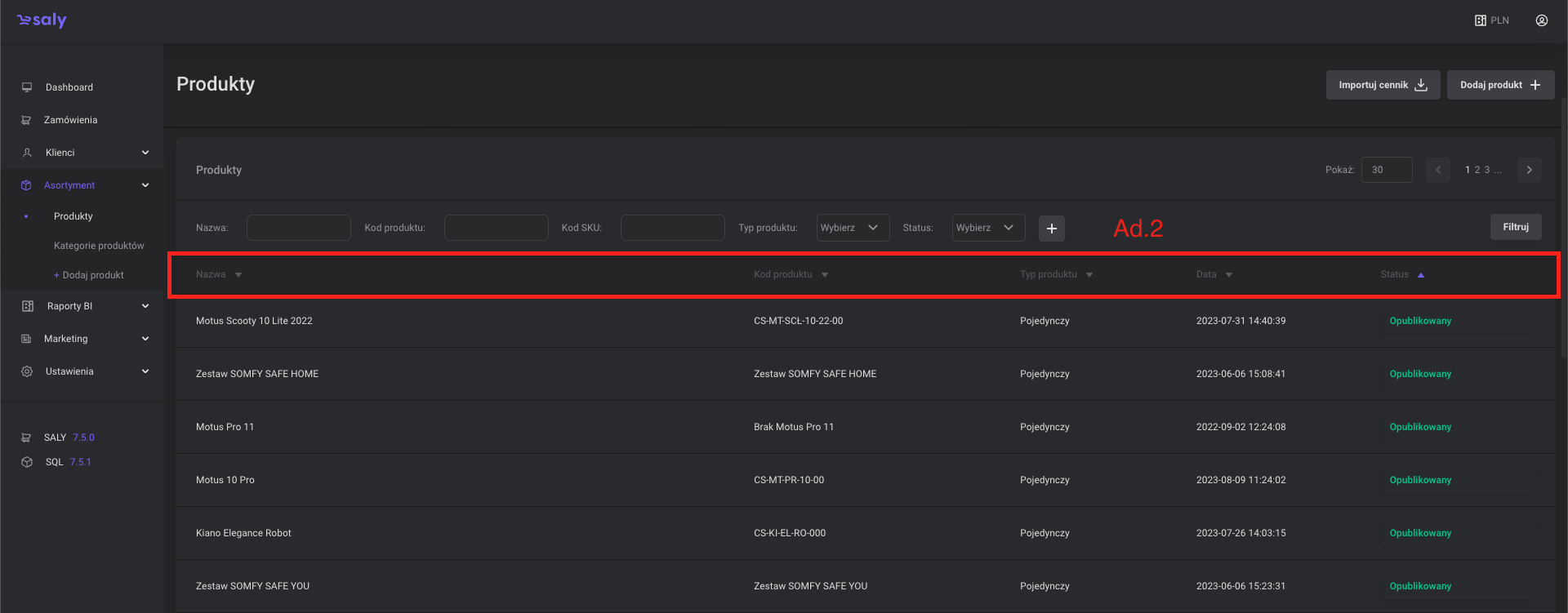 Sortowanie. Aby posortować produkty, naciśnij symbol strzałki przy nazwie cechy, według której chcesz dokonać sortowania. W zależności od wartości sortowanie odbywa się alfabetycznie (od A do Z i od Z do A) lub rosnąco / malejąco (w przypadku danych liczbowych). W przypadku, gdy sortowanie jest aktywne, strzałka znajdująca się przy nazwie kolumny zmieni się na kolor niebieski.