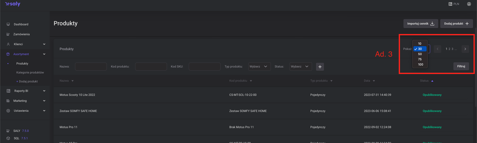 Liczbę pozycji widocznych na liście możesz ustalić w okienku Pokaż. W tym celu z rozwijanej listy wybierz odpowiednią opcję tj. wynik 50, 75 lub 100 pozycji.