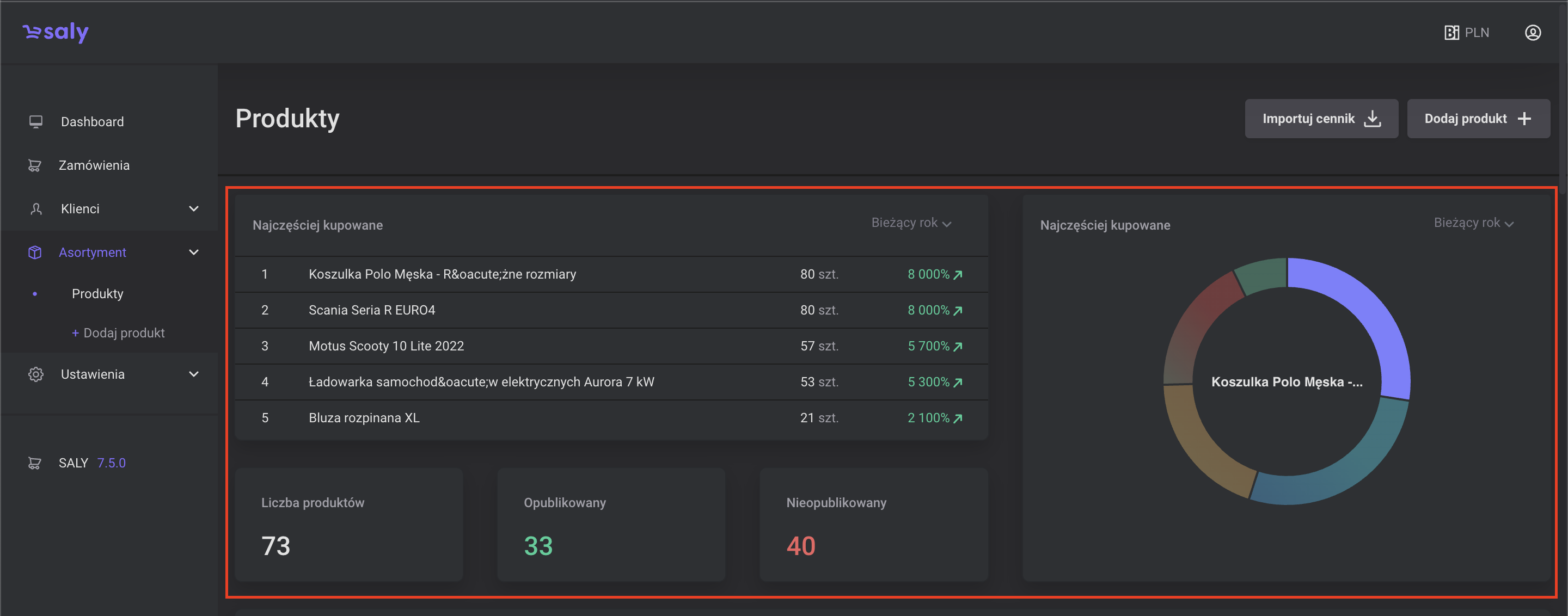Najczęściej kupowane - po prawej stronie znajdziesz kafelek z wykresem kołowym prezentującym odsetek sprzedanych produktów z danej kategorii, w wybranym przedziale czasowym.