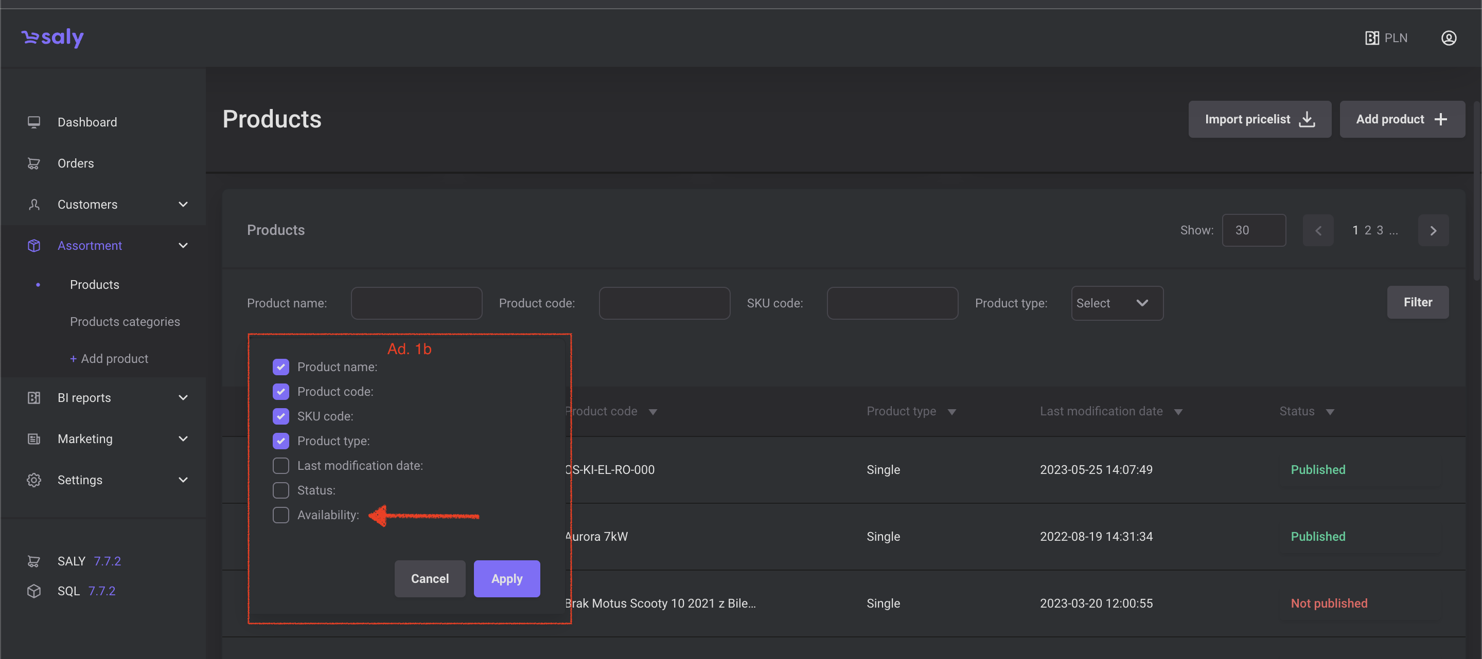 Filtrowanie. Na listę produktów możesz nałożyć filtry według: nazwy, kodu produktu, kodzie SKU, typie produktu. Dodatkowo lista zawiera zbiór filtrów ukrytych pozwalających na filtrowanie po dacie ostatniej modyfikacji czy statusie.