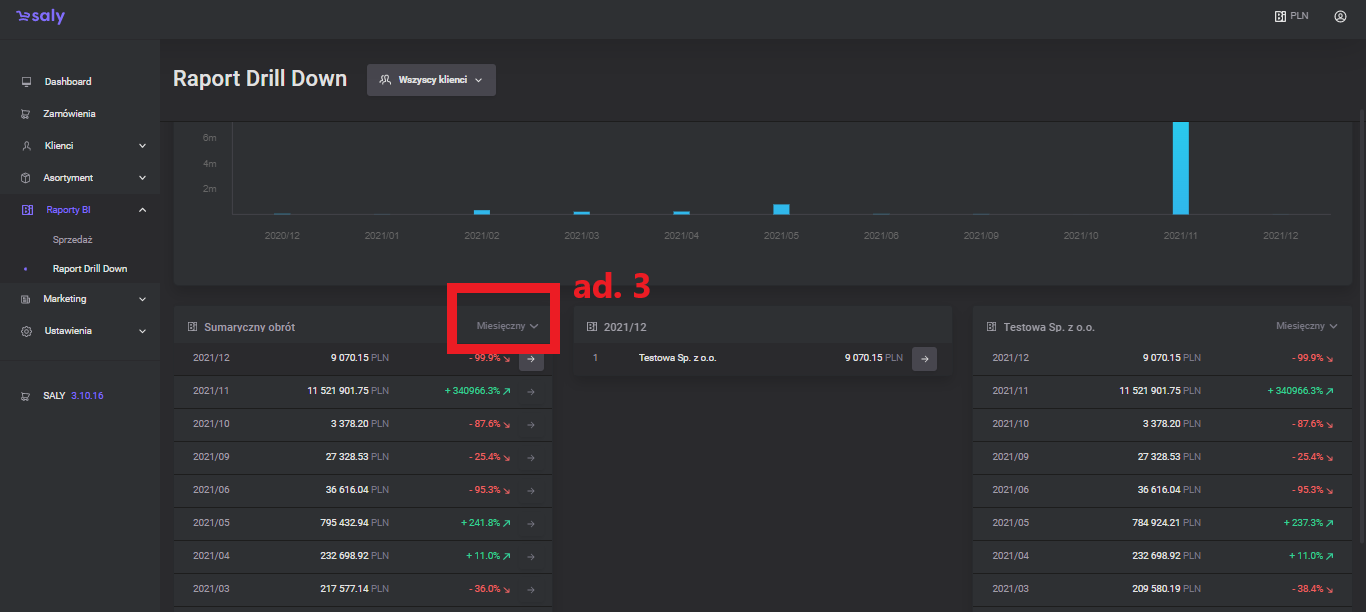 After pressing the arrow next to the customer's name (at the end of the line in a new column), you will expand the list of turnover generated by this customer in the selected period, broken down by months.