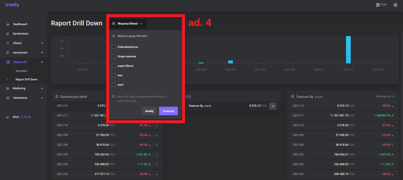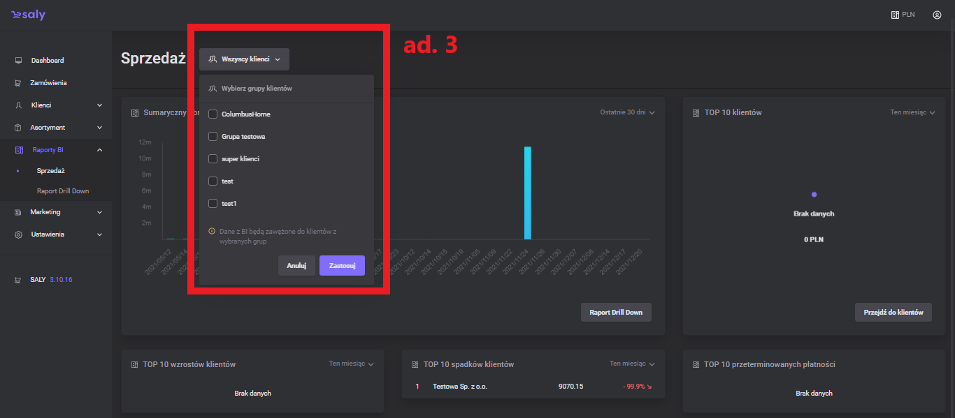 1.0 Pierwsza wersja instrukcji. | 07.03.2022 | sprzedaż, sumaryczny obrót klientów, top 10, zmiana przedziału czasowego, generowanie raportów, raport drill down |