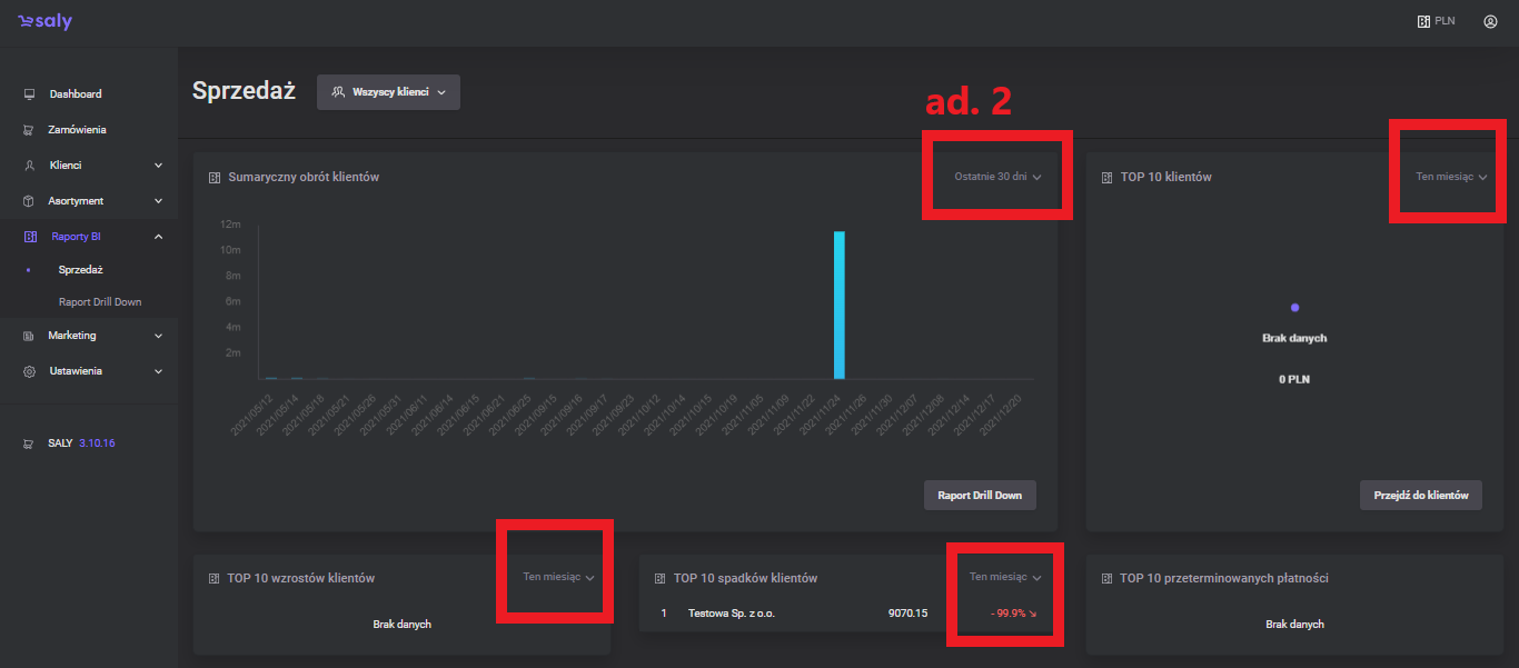 On the subpages with BI (Business Intelligence) reports, you will find statements on the turnover generated by customers. Thanks to them, you can make several analyzes regarding customer behaviour, including declines or increases in turnover.