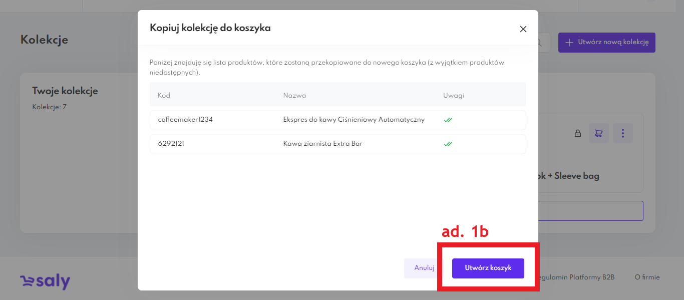 W nowym oknie pojawi się informacja o utworzeniu nowego koszyka niewysłanego wraz z jego nazwą. Aby przejść do koszyka, naciśnij przycisk Przejdź do koszyka. Information about creating a new unshipped cart with its name will appear in a new window. To go to the cart, press the button Go to cart.