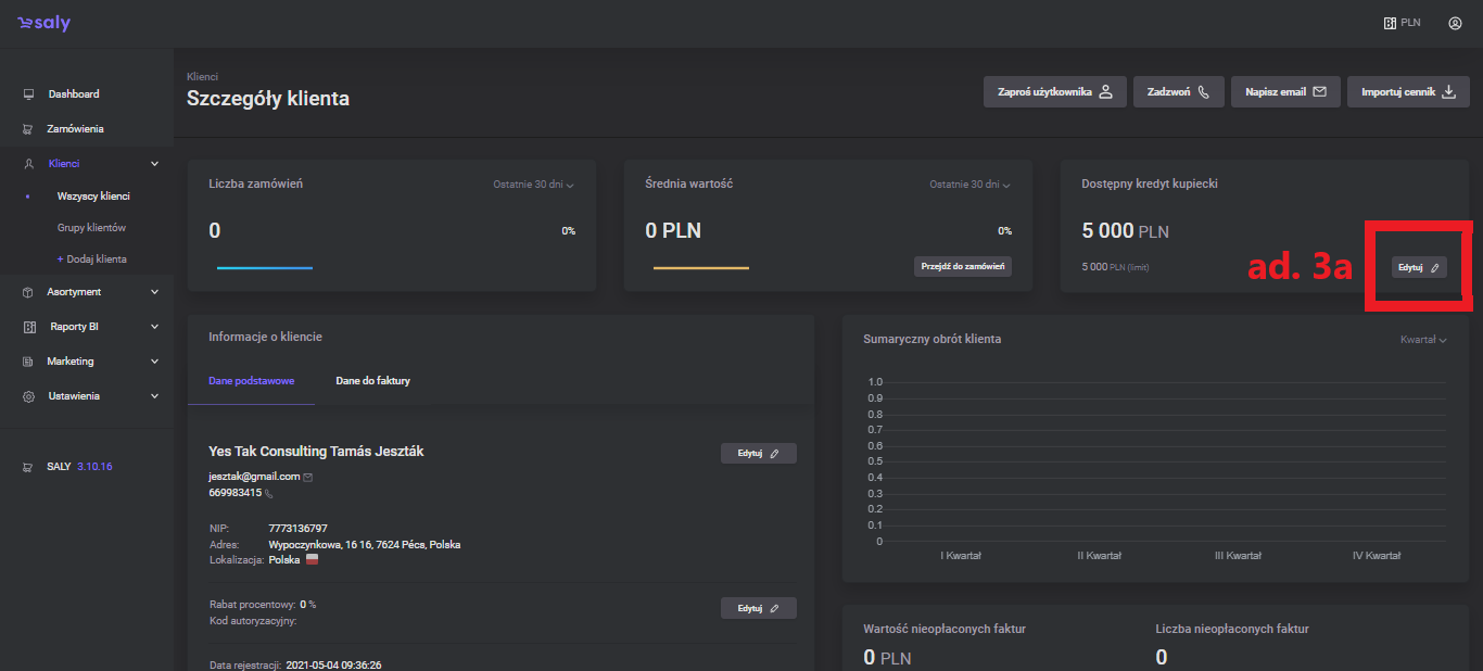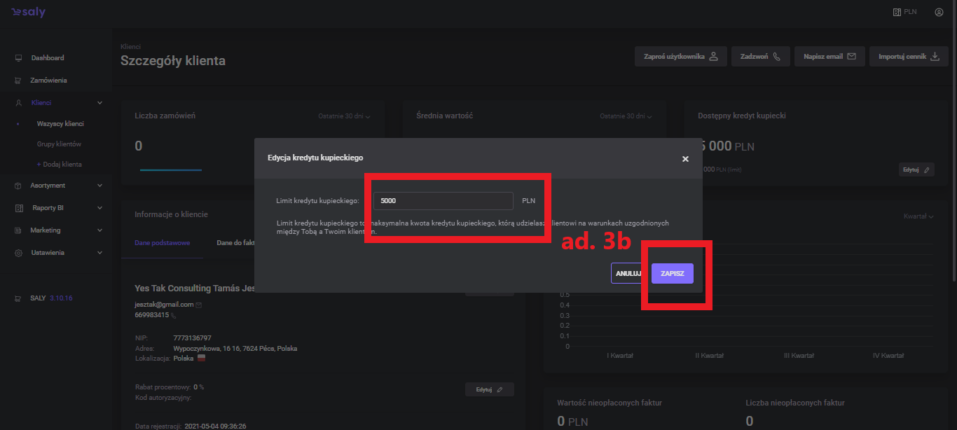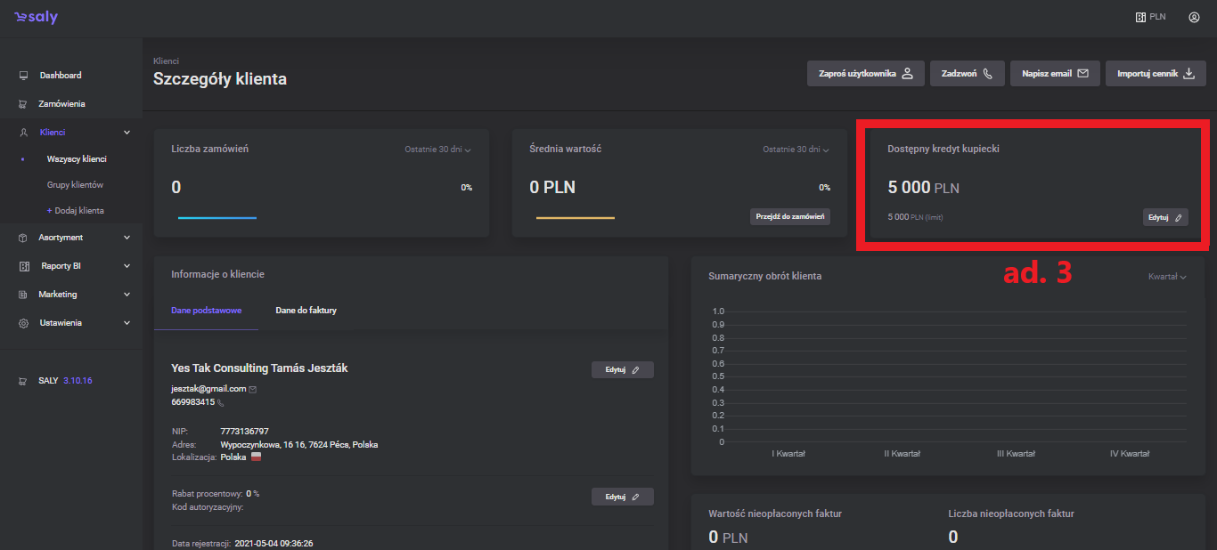 Merchant credit available - trade credit value, i.e. the maximum amount up to which the customer can make purchases with deferred payment. You set this value individually with each client. To edit an available merchant credit: