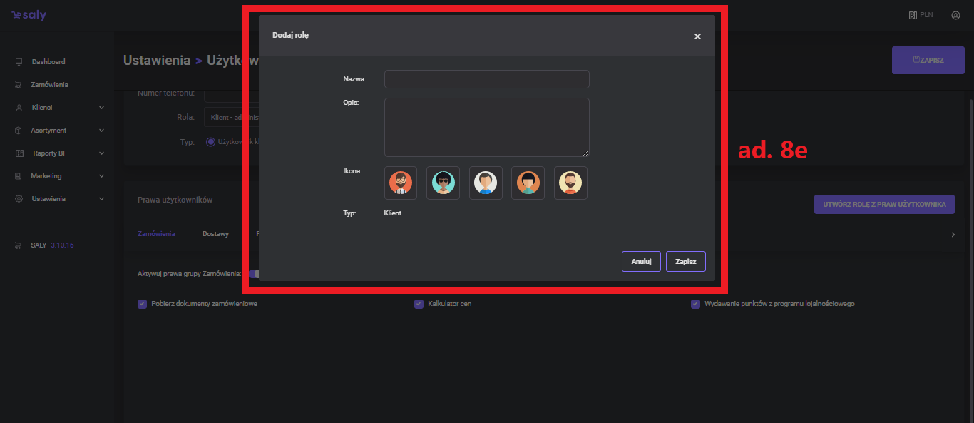 Adding roles. Based on the saved permissions of a specific user, you can also create a new role for a company account. To do this, press the Create role with user permissions button, fill in the name and description, select the icon, and then press the Save button. You can next grant a role with the same privileges to each user from this account, following the instructions in point 8a of this manual.