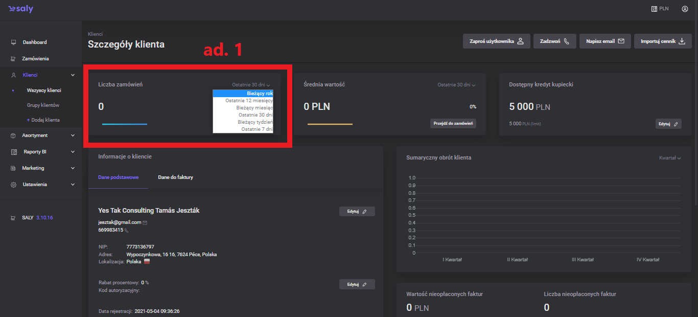 The number of orders - information on the total number of orders placed by the customer in the selected range. To change the time period, select the appropriate option from the drop-down list.