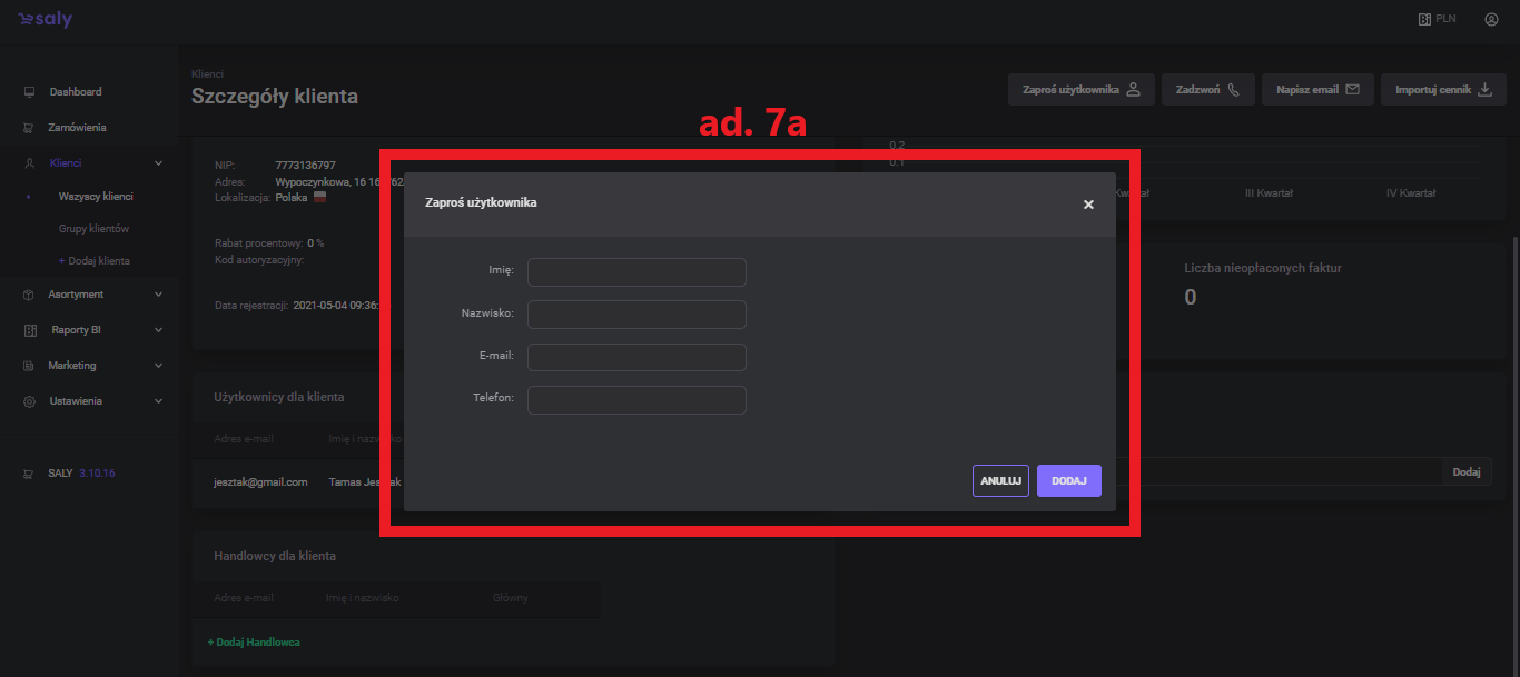 To invite a user to an account, press the Invite User button. In the newly opened window, enter his name, surname, e-mail address and telephone number, and then press the Add button.