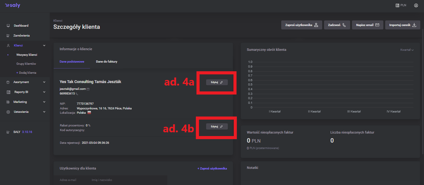 To edit the address details, contact details and invoice details, press the Edit button. After entering the appropriate data, press the Save button.