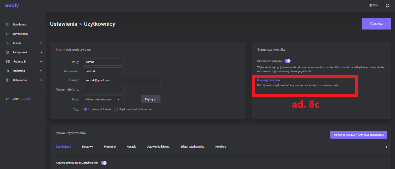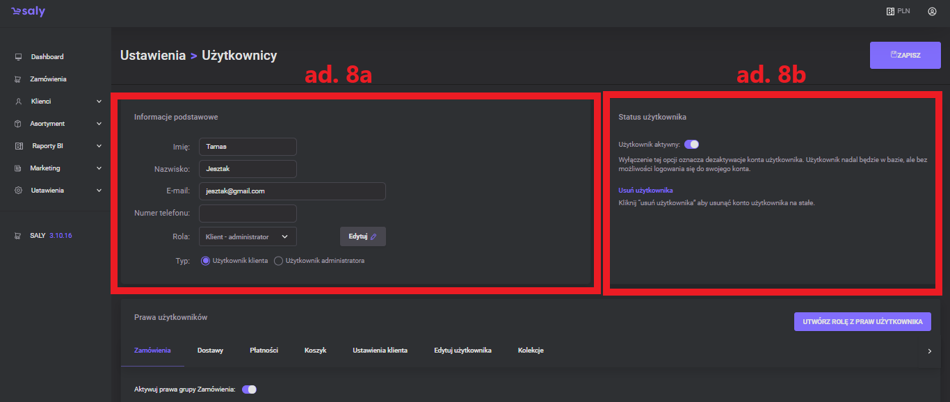 Basic data editing. To edit basic user information (contact details, role and user type), enter or select appropriate data from the drop-down list, and then press the Save button in the upper right corner.