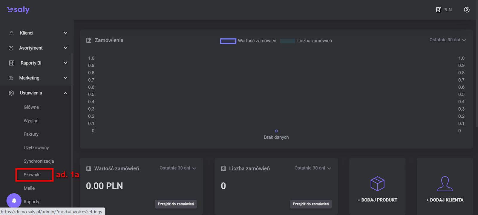 a) Wybierz w panelu po lewej stronie “Ustawienia”, a następnie na liście rozwijanej “Słowniki”.