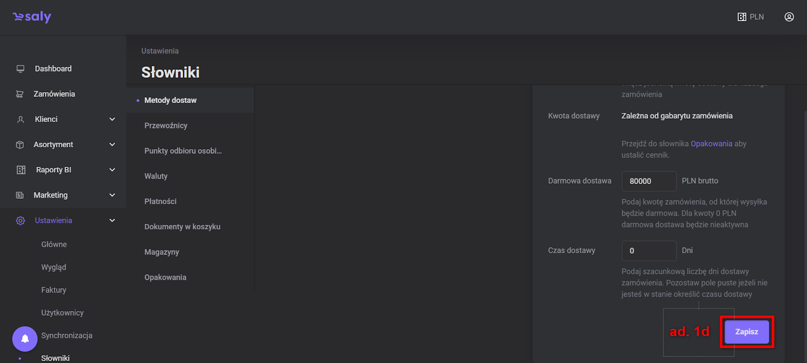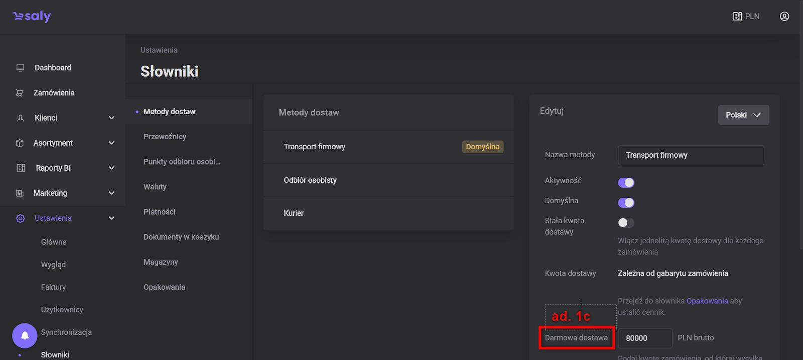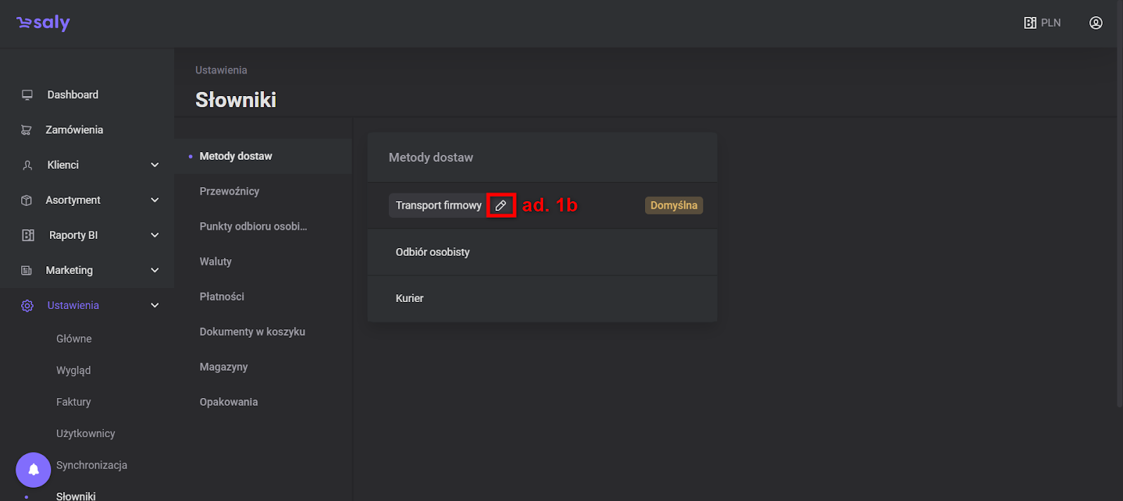 Widok 1. Dostęp do edycji metod dostaw.