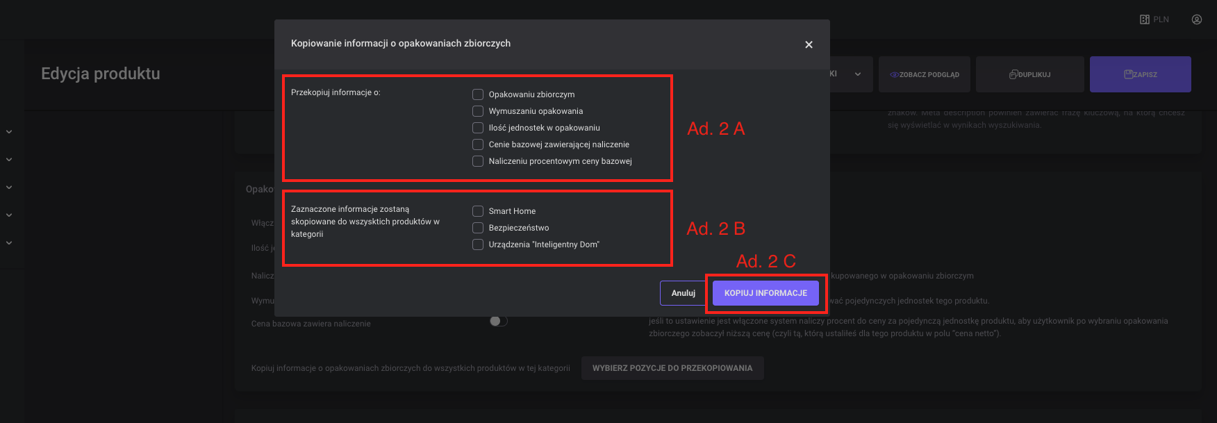 2. W przypadku, gdy wprowadzone w formularzu parametry konfiguracyjne, dotyczące Opakowań zbiorczych mogą zostać (w całości lub części) wykorzystana do produktów należących do całej kategorii lub produktów w zupełnie innej kategorii, możliwe jest skorzystanie z opcji Kopiuj informacje o opakowaniach zbiorczych do wszystkich produktów w tej kategorii. W tym celu należy użyć przycisku Wybierz pozycje do przekopiowania, a następnie:
