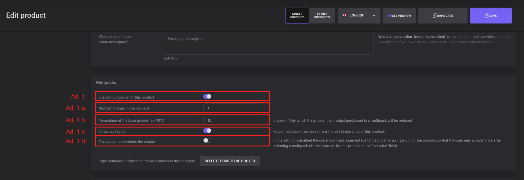 a. Wskazać Ilość jednostek w opakowaniu zbiorczym np. jeśli sprzedajemy świecę zapachową, ale dajemy także możliwość zakupu jej w czteropaku, w polu należy wpisać liczbę 4.