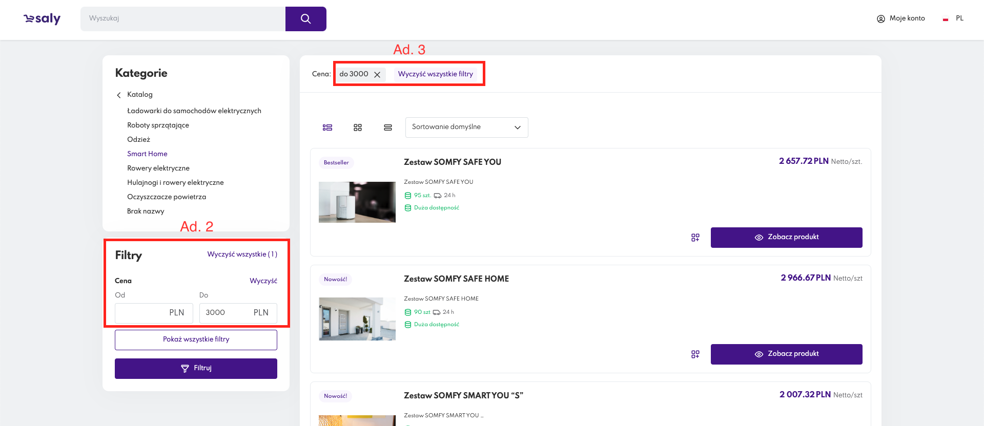 Widok 1. Filtrowanie po cenie.