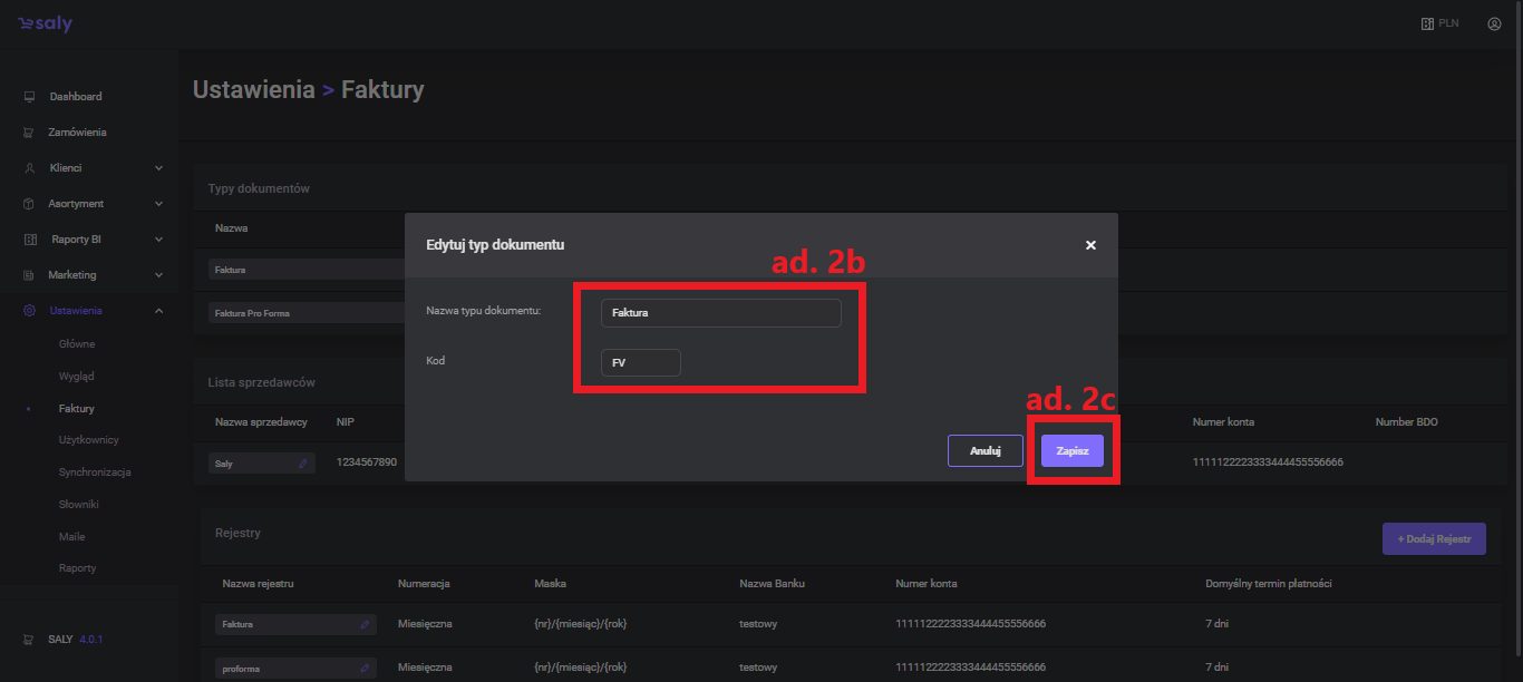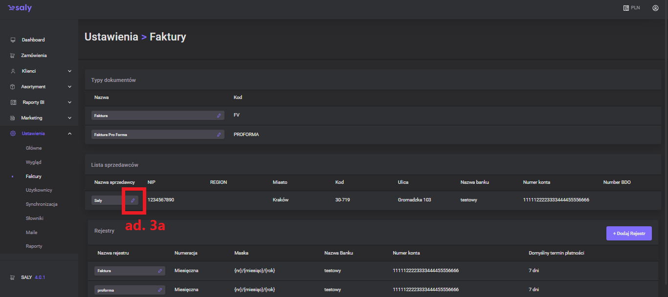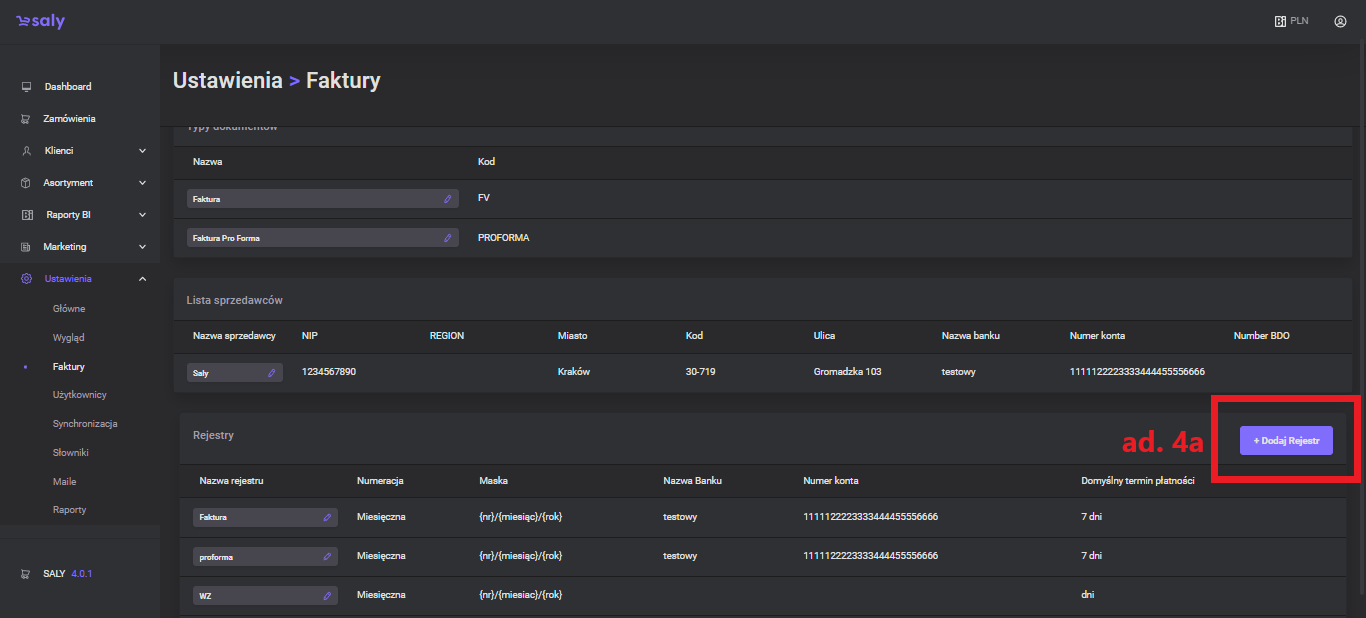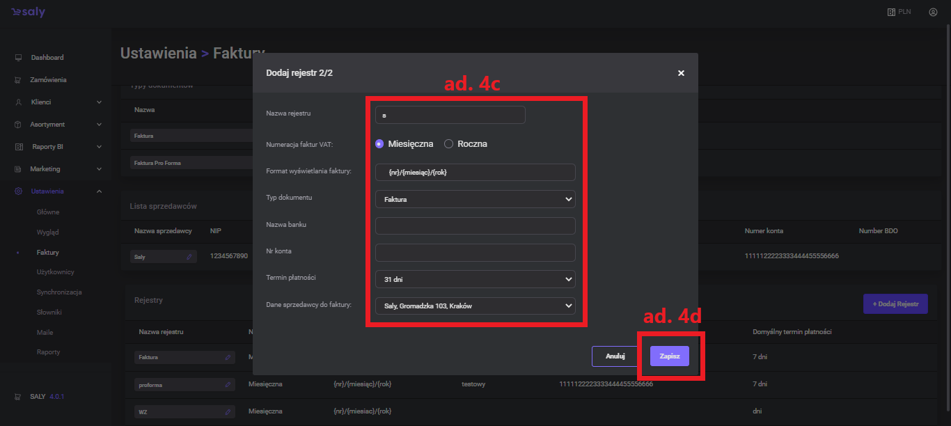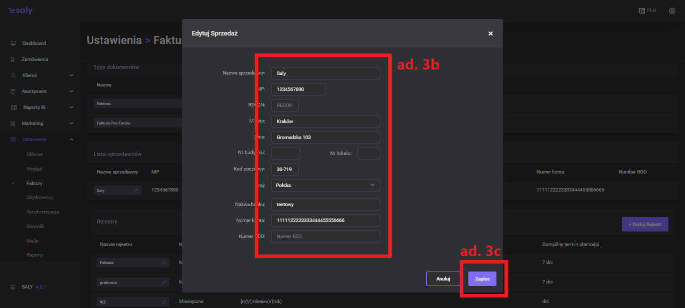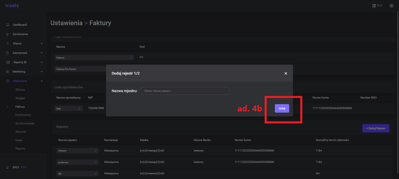 In the next step, complete the registry data, incl. invoice numbering, document display format, bank account number or due date.