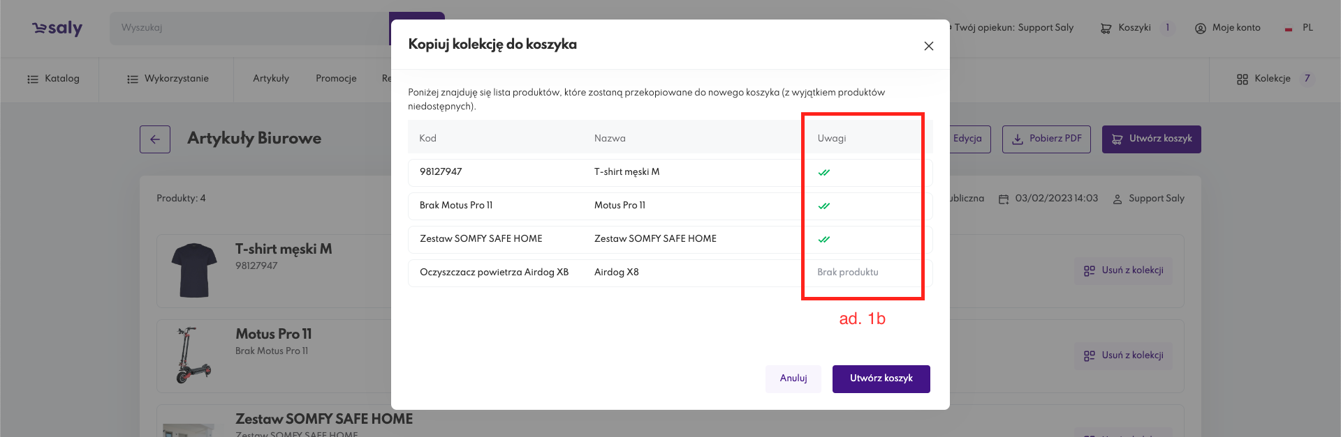 W odrębnym oknie, system poinformuje Cię o tym, czy wszystkie produkty z Twojej kolekcji są obecnie dostępne do zakupu. W przypadku produktów z zerowym stanem magazynowym lub wycofanych ze sprzedaży, w kolumnie Uwagi pojawi się odrębny komunikat “Brak produktu”.