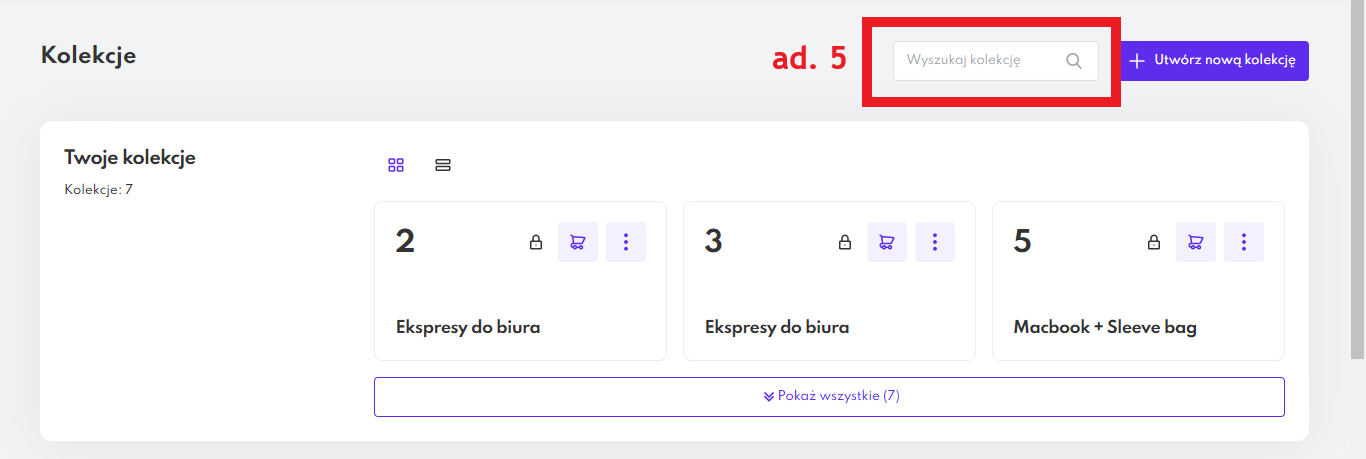 Aby wyszukać konkretną kolekcję, wpisz jej nazwę w pole wyszukiwarki znajdującej się po prawej stronie.