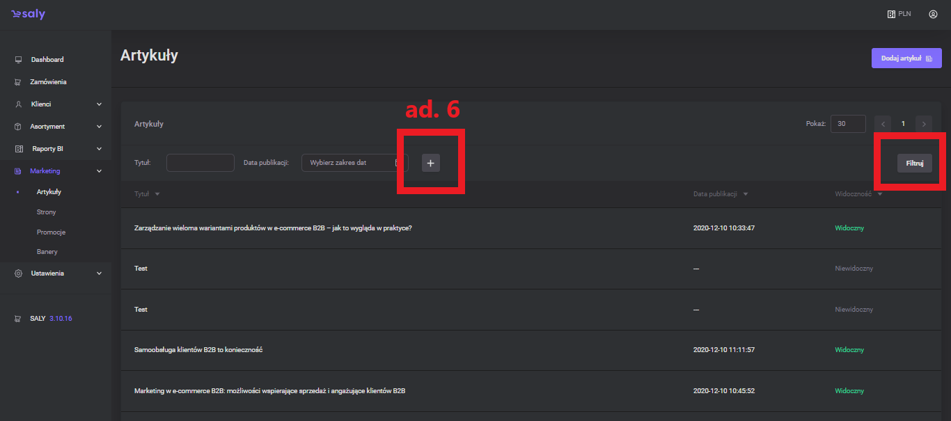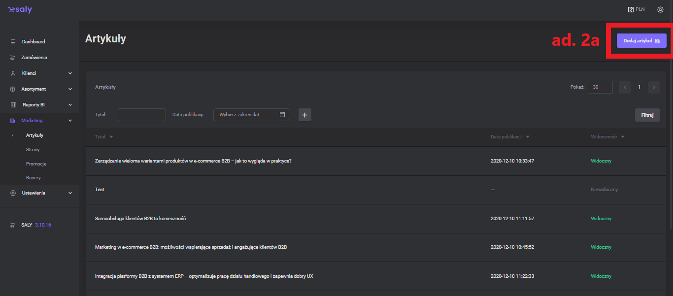 In the list of articles, you will find titles, publication dates and information about the visibility of articles.