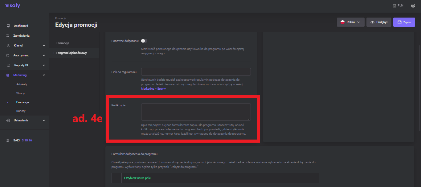 Formularz dołączenia do programu. Po naciśnięciu przycisku Wybierz nowe pole zobaczysz nowe okno z listą pól, które możesz dodać do formularza. Aby dodać nowe pole, najedź kursorem na wybraną opcję i naciśnij przycisk Wybierz.