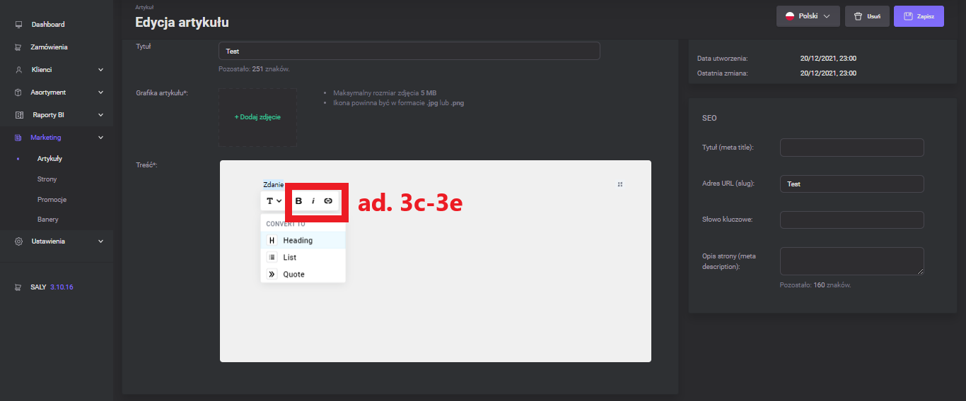Editing an existing article. You can edit the content of an article, change its status, add new graphics or complete SEO information. To do this: