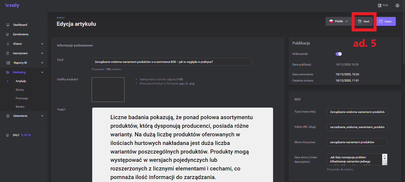 After writing the article and performing other activities (e.g. adding graphics or supplementing information related to SEO), press the Publish article button.