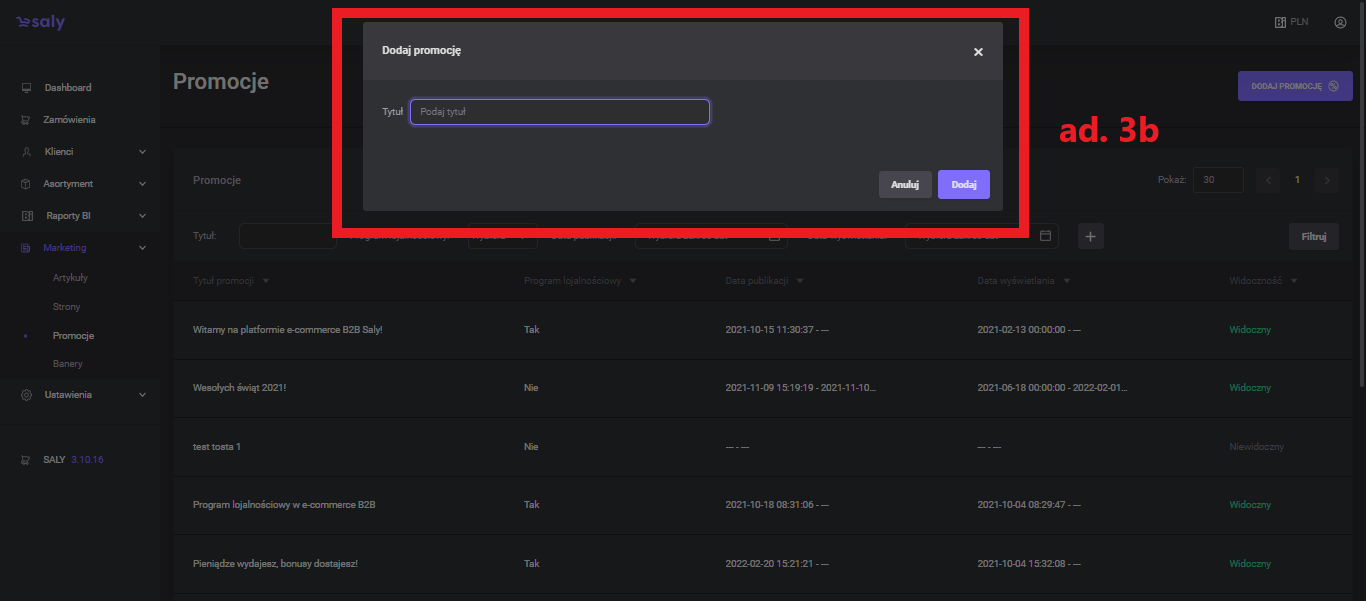 In the newly opened window, enter the title of the promotion, and then press the Add button.