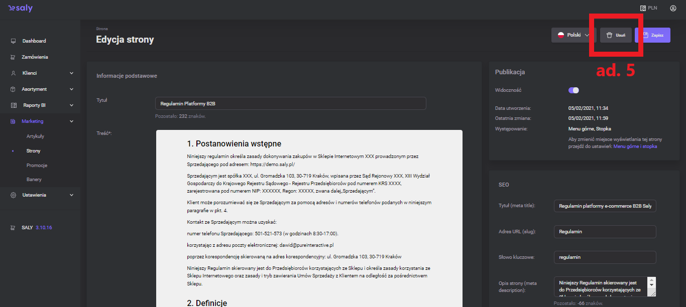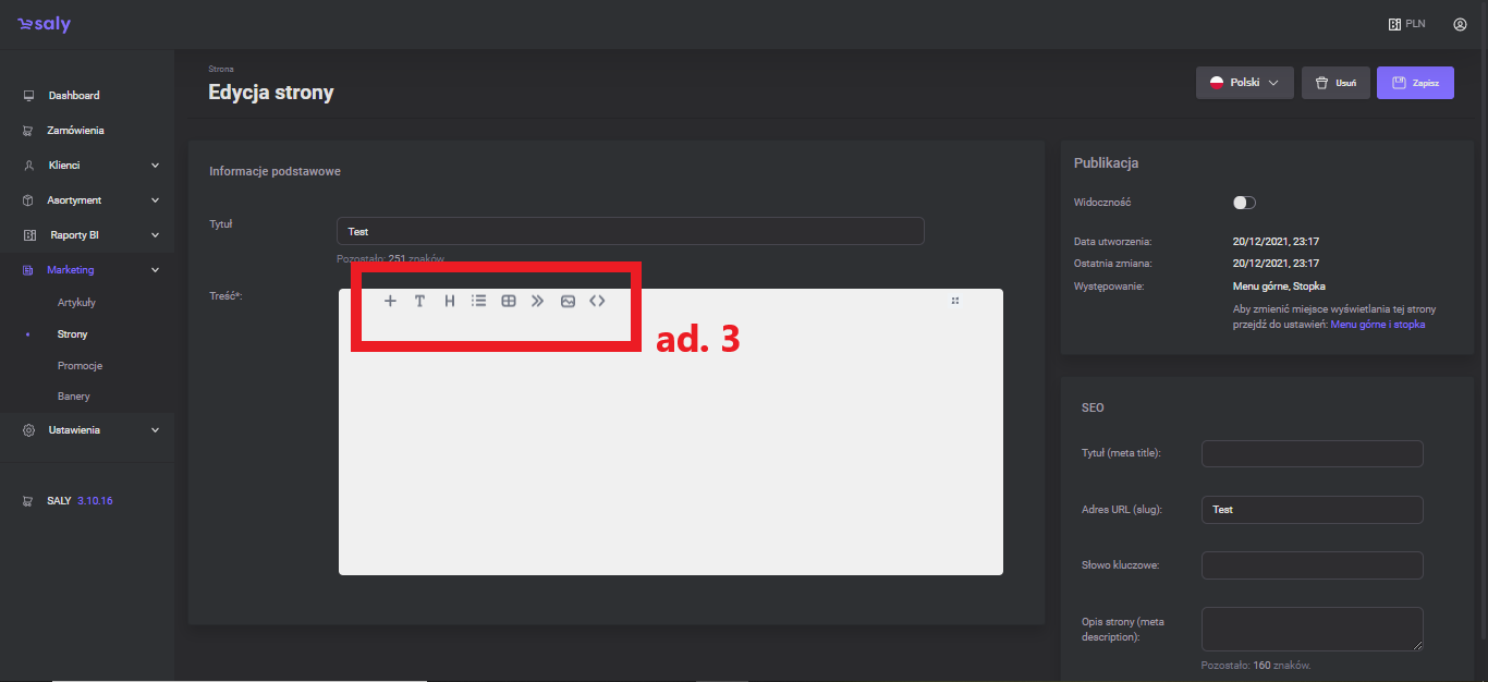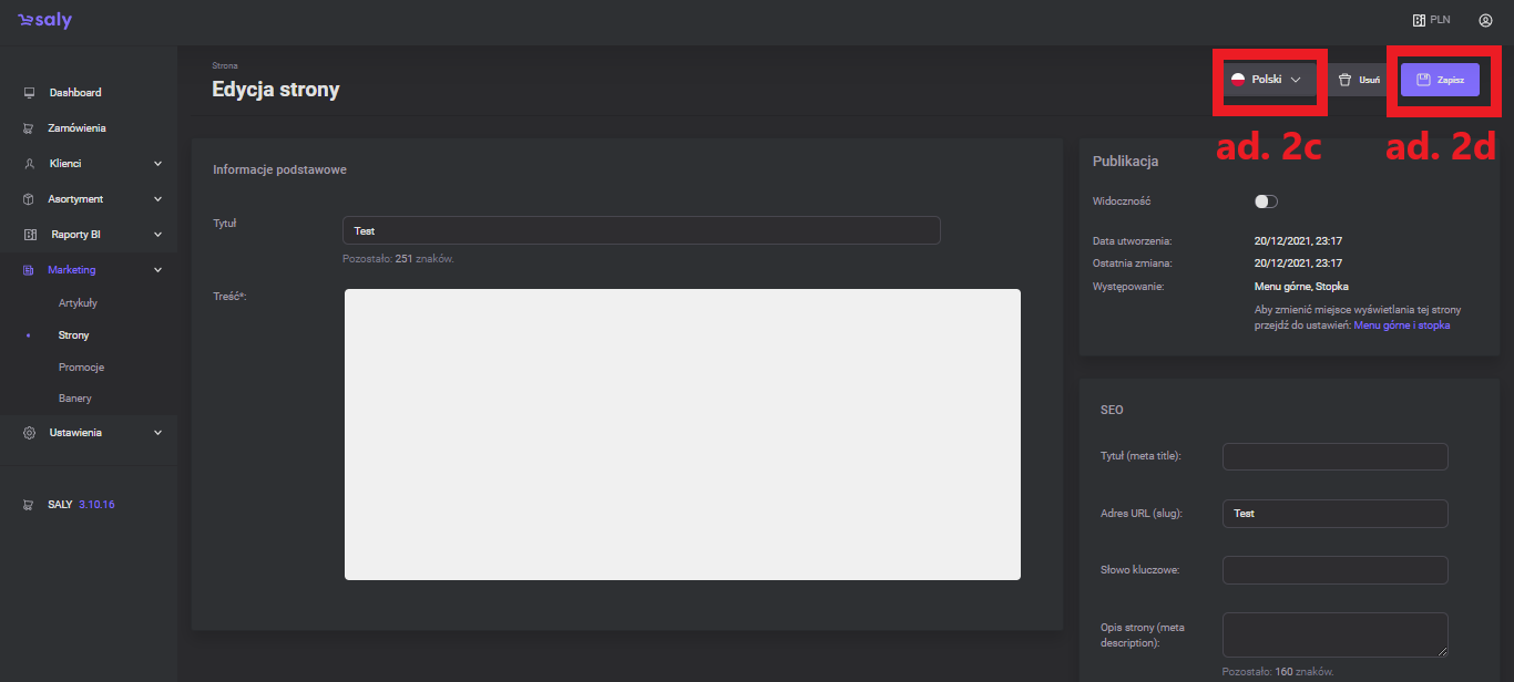 After writing the content of the page and performing other activities (e.g. adding graphics or supplementing information related to SEO), press the Save button. To change the page display location, go to the top menu and footer settings.