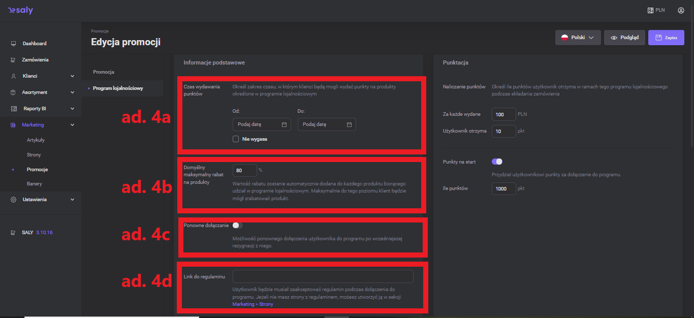 Punctation. Specify how many points a program participant will receive for using a certain amount. If you want to award users points for joining the program, move the slider with the information Points to start and specify the number of points.