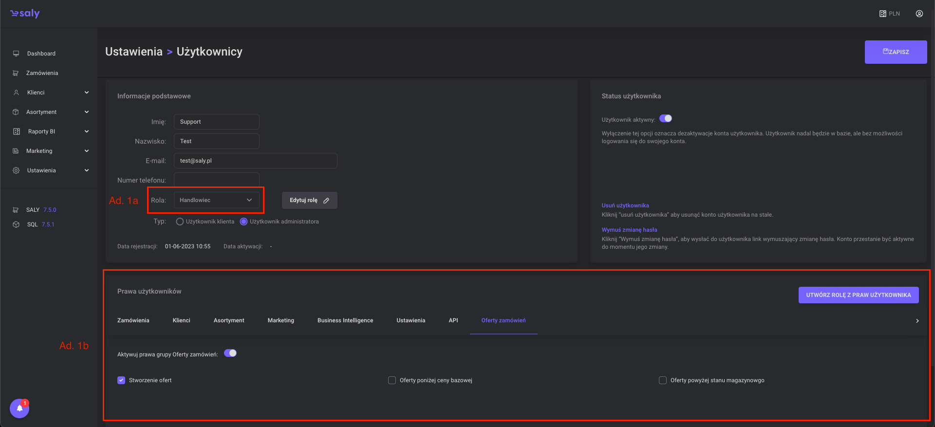 Aby uruchomić funkcje Ofery nie jest wymagana dodatkowa konfiguracja, wystarczy, aby przynajmniej jeden użytkownik z rolą Handlowca, w obrębie Twojej organizacji miał włączone prawo dotyczące dostępu do funkcjonalności Oferty. W tym celu należy stworzyć lub wybrać z listy istniejących Handlowców osobę uprawnioną do składania ofert. Podążaj ścieżką Ustawienia → Użytkownicy w Twoim koncie administracyjnym, a następnie otwórz kartę wybranego przez Ciebie Handlowca. Następnie: