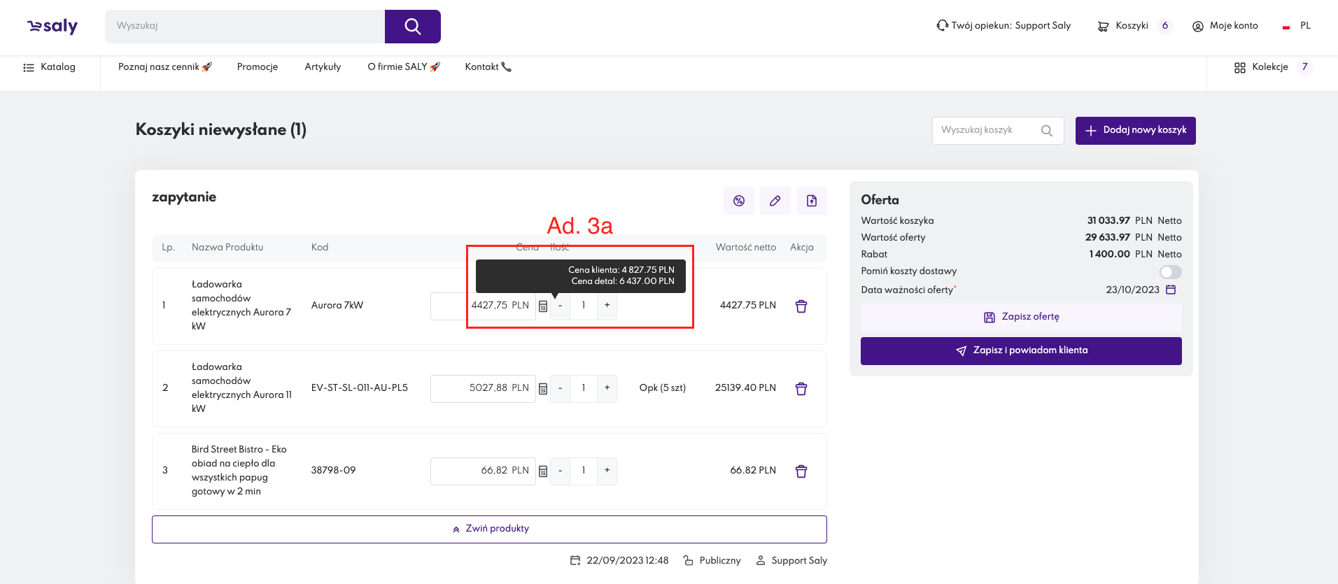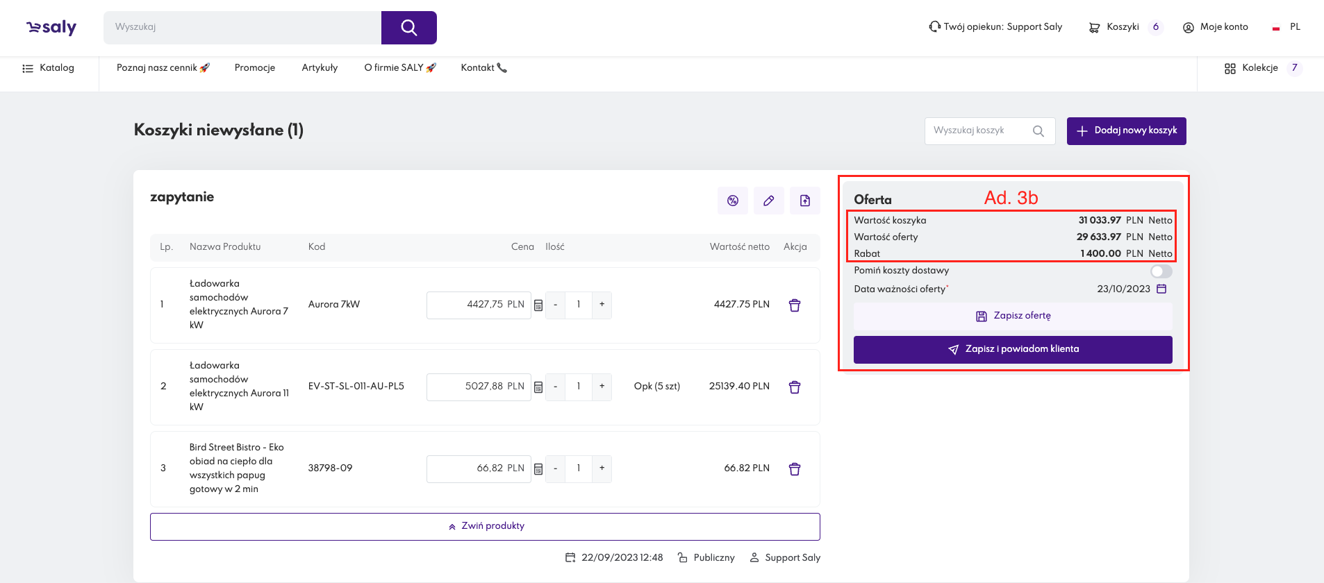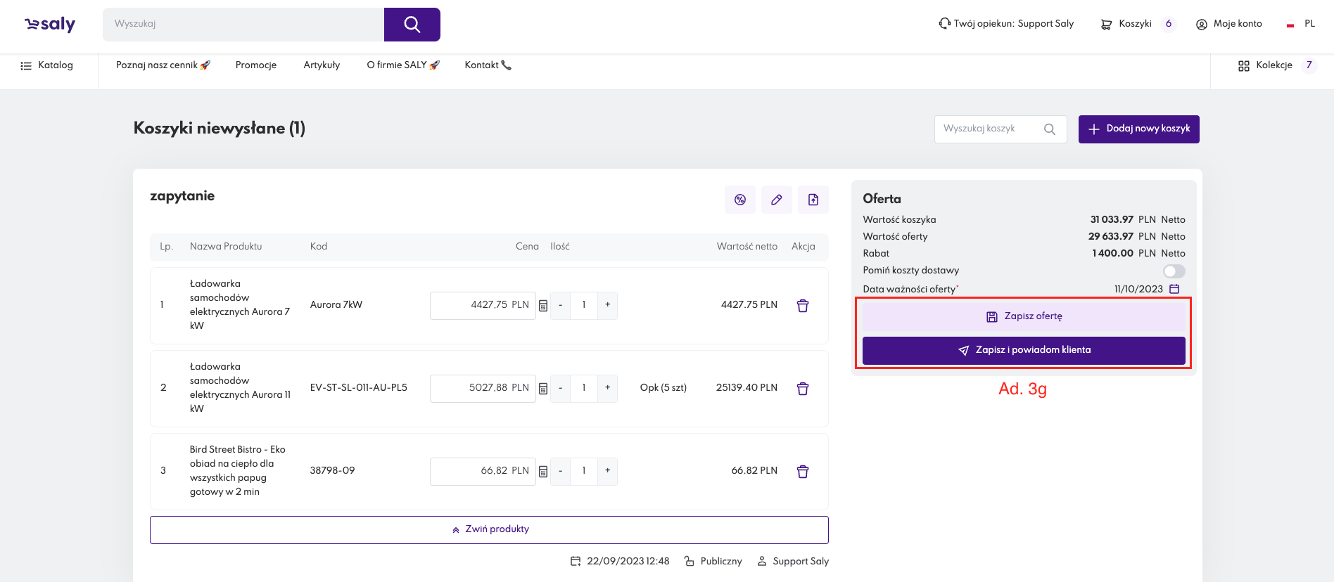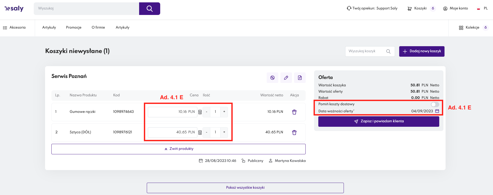 F. po zakończeniu konfiguracji Oferty specjalnej użyj przycisku Zapisz i powiadom klienta. Wówczas, do właściciela koszyka zostanie przesłana notyfikacja mailowa informująca o przygotowanej Ofercie specjalnej. Kopia wiadomości zostanie wysłana także na Twój adres mailowy.