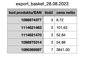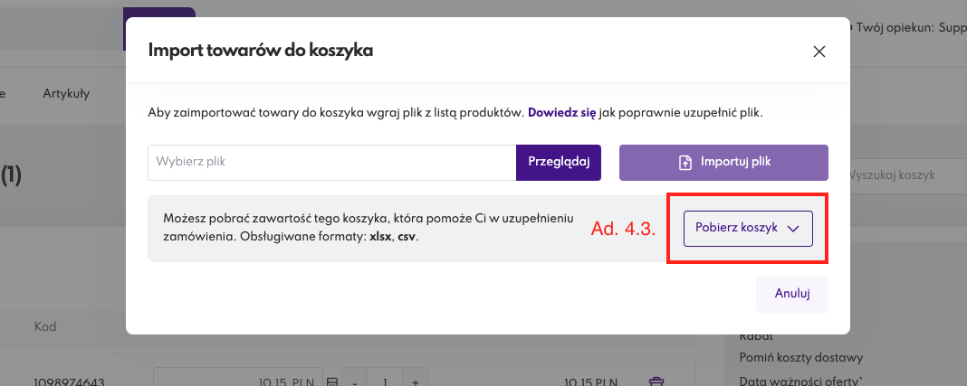 pobrania pliku wzorcowego do importu - Pobierz koszyk, w formacie .csv lub .xlxs,