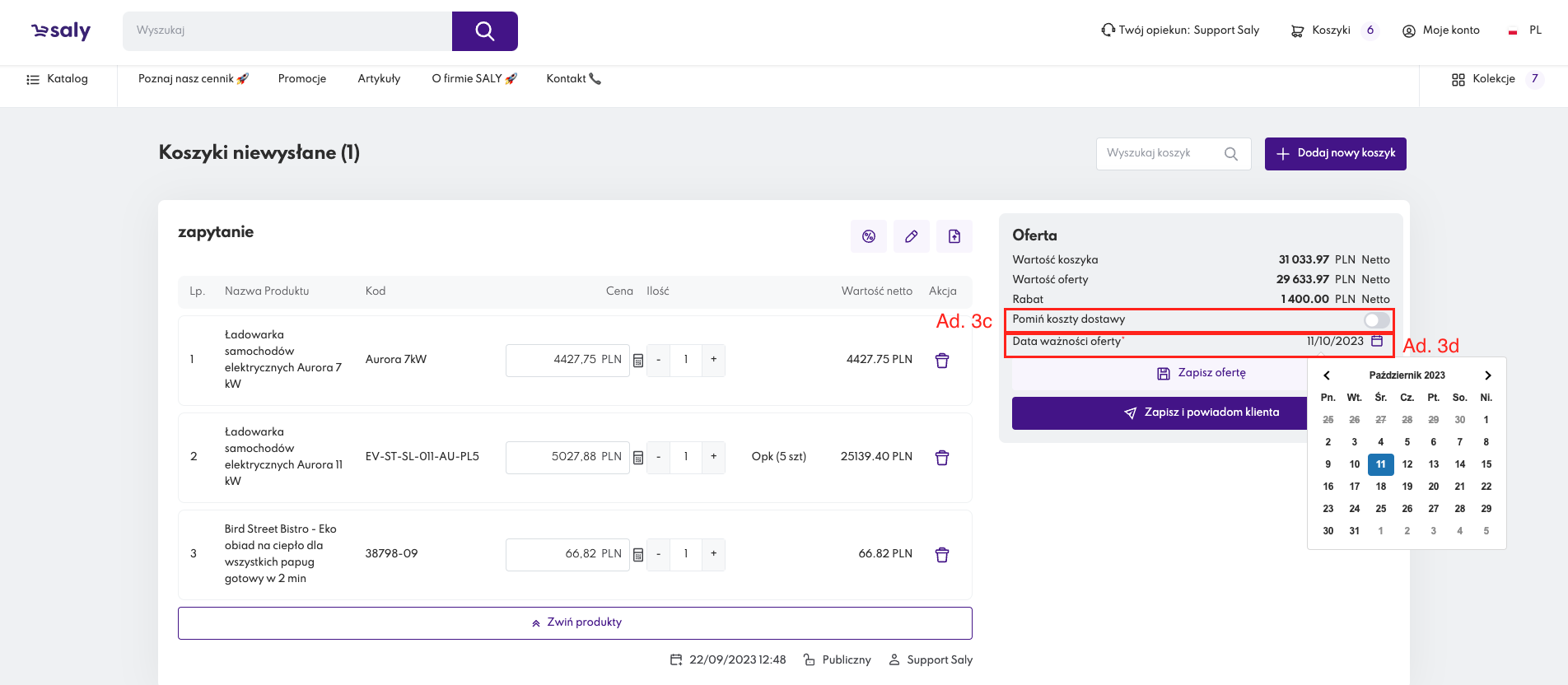 Widok 3. Przyciski Pomiń koszty dostawy i Data ważności oferty