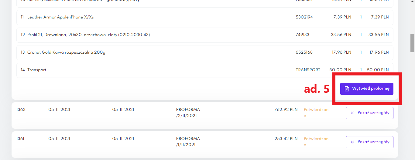 Document (invoice). To view the document generated during the order, press the Show Details button. Then, at the end of the drop-down list with products, select the View Proforma or View Invoice button. The order document will be automatically downloaded in PDF format.