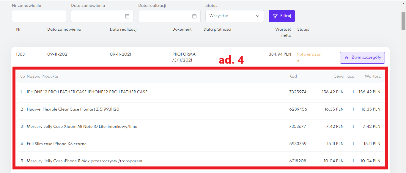 Order details. After pressing the Show details button, you will receive the following information about the products ordered: