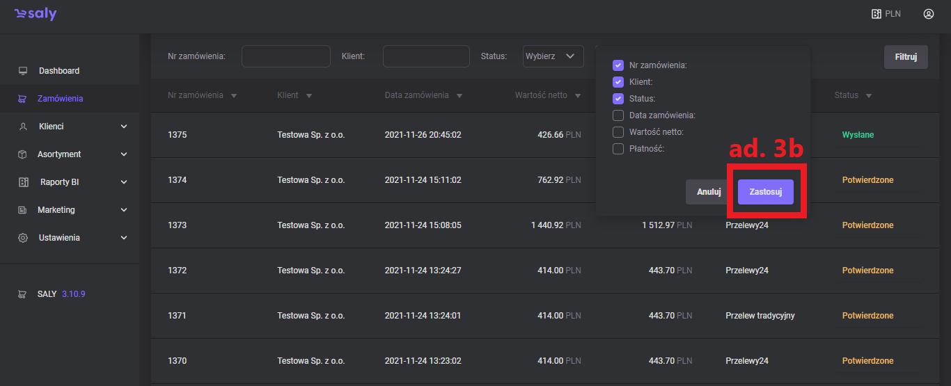 Additionally, you can filter orders by order date, net value and payment type. To do this, expand the filtering options using the plus symbol, select the filtering options you are interested in and press the Apply button.