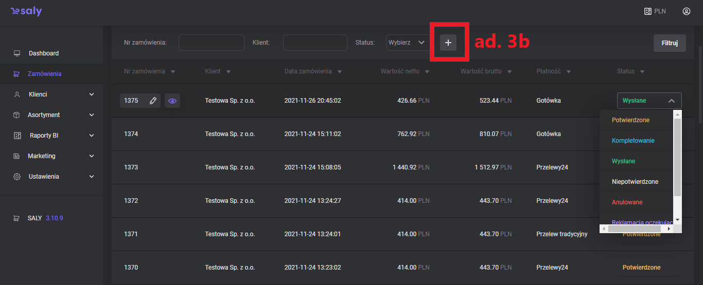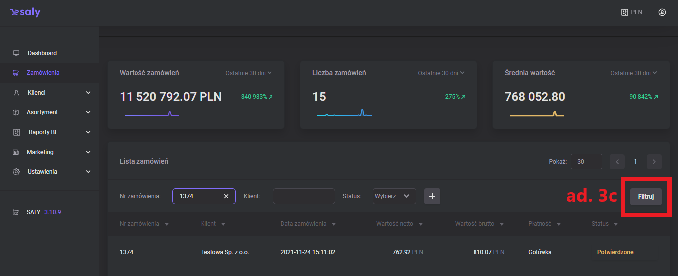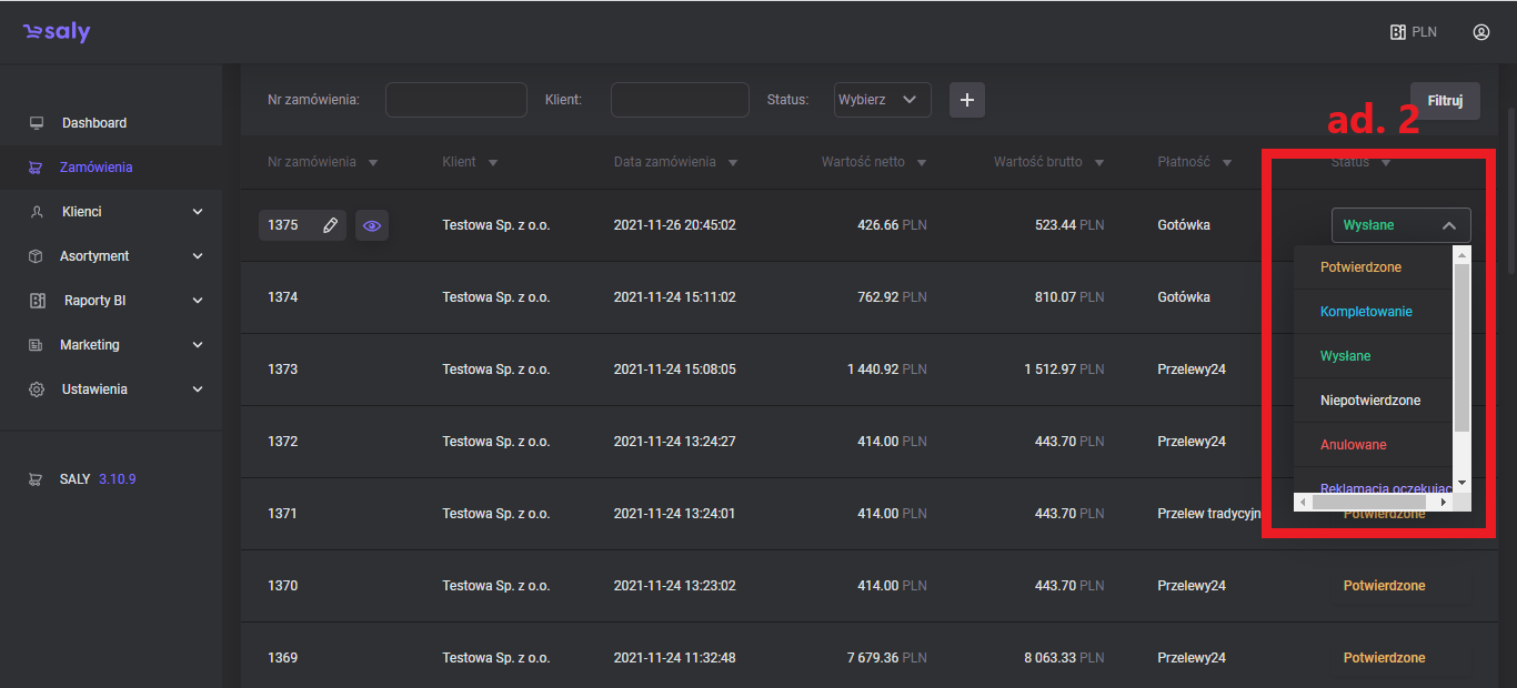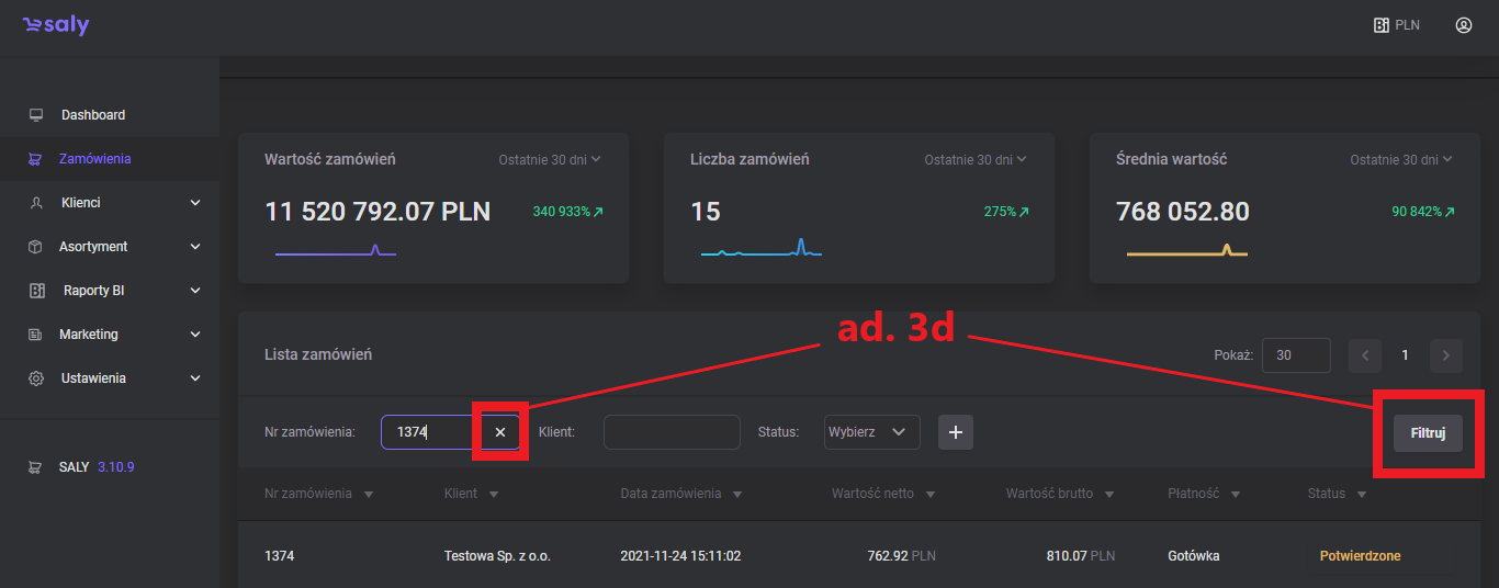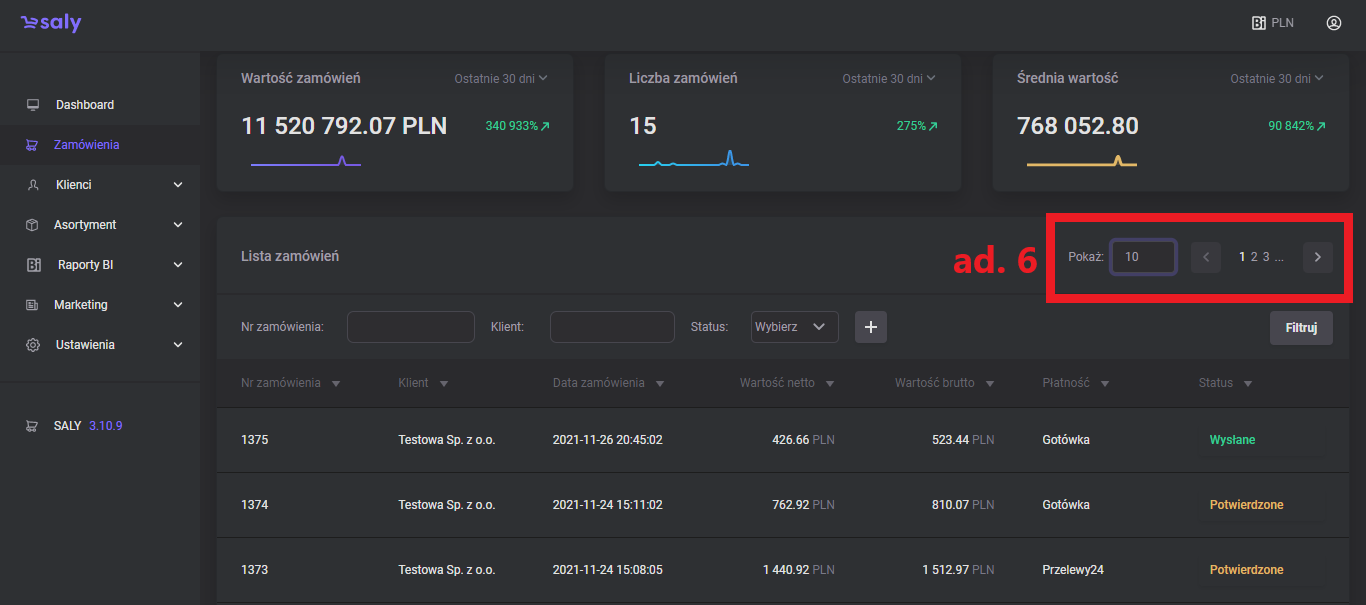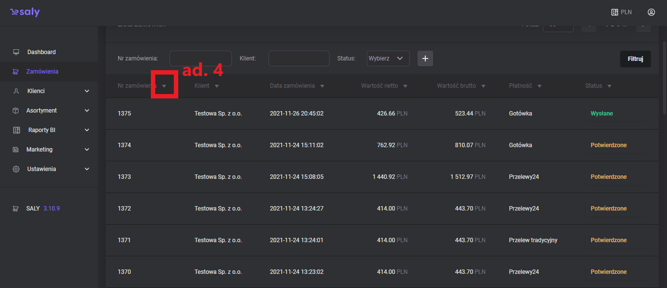 1.0 Pierwsza wersja instrukcji. | 04.03.2022 | lista zamówień, zmiana statusu zamówienia, filtrowanie danych, sortowanie danych, szczegółowe informacje na temat zamówienia, paginacja, edycja zamówienia |