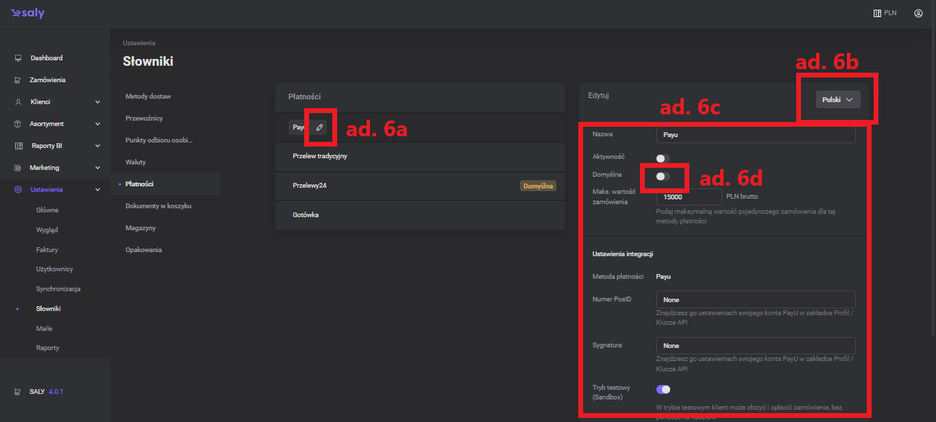Płatności. W tym polu możesz zdefiniować i wybrać rodzaj płatności, zintegrować ją z zewnętrznym systemem oraz ustawić maksymalną wartość zamówienia dla wybranych rodzajów płatności.