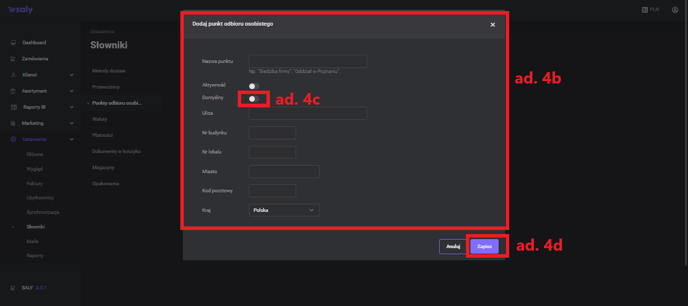 W nowo otwartym oknie uzupełnij nazwę oraz dane adresowe punktu odbioru osobistego.