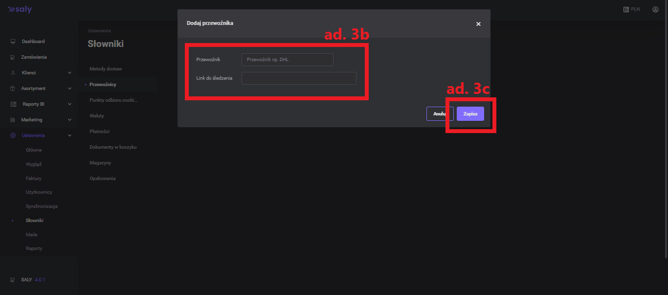 Przewoźnicy. W tym polu możesz zdefiniować informacje na temat przewoźników i dodać link, który umożliwi Twoim klientom śledzenie przesyłki.