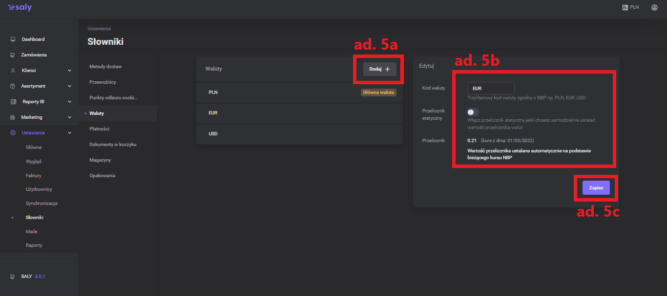 Waluty. W tym polu możesz dodać waluty oraz ustawić sposób przeliczania kwoty pomiędzy różnymi walutami. Główną (domyślną) walutą jest PLN.