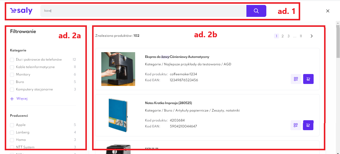 b. W dalszej kolejności możesz filtrować wyniki wyszukiwania według kategorii produktów lub producentów.
