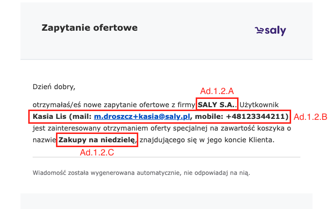Po przesłaniu Zapytania ofertowego przez Twojego Klienta, otrzymasz komunikat mailowy zawierający nastepujące dane: